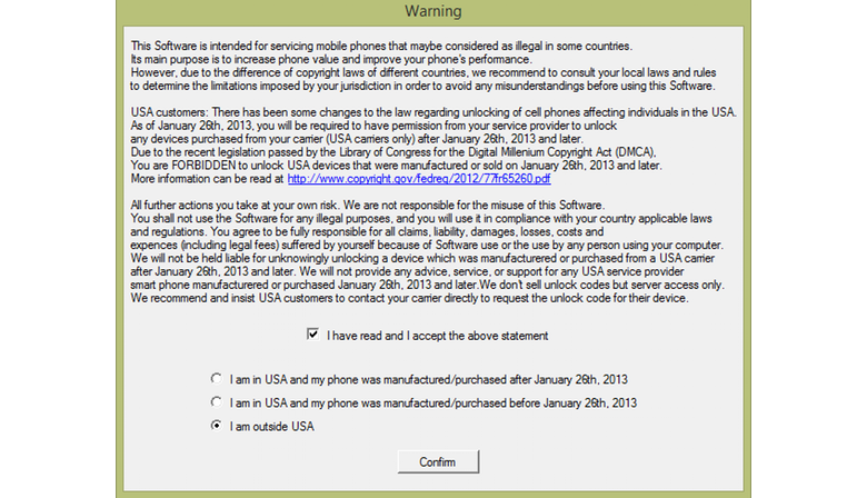 - Once launched, this program will open another window with information. Simply tick the “I have read and I accept the above statement” and “I am outside USA” boxes. Then press the Confirm button.